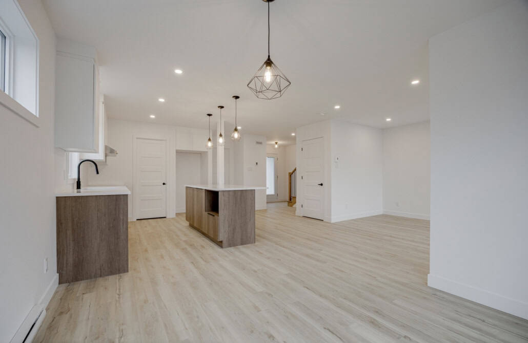 - Au rez-de-chaussée : Une aire ouverte spacieuse comprenant un salon lumineux, une salle à manger conviviale et une cuisine personnalisable avec îlot central et garde-manger walk-in. Une salle d’eau et une buanderie complètent cet espace pratique.